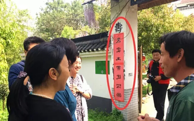 剛進大山村沒幾步,敬一丹瞬間被一家農家樂門口的對聯吸引住了——對聯上的居然是反的。農家樂老板向敬一丹“小露一手”,敬一丹對老板的書法春韻慢城贊不絕口,還為書法蓋了章,稱贊老板:“果然是高手在民間!”接下來就是合影留念啦。