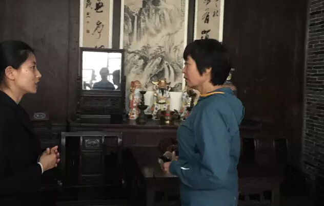 敬一丹來到了楊廳參觀,工作人員正在和她講楊廳的歷史,原來楊廳曾經是明清時期一戶商人的家,樓下是兒子、父母的臥室以及客廳,樓上是小姐的閨房。
